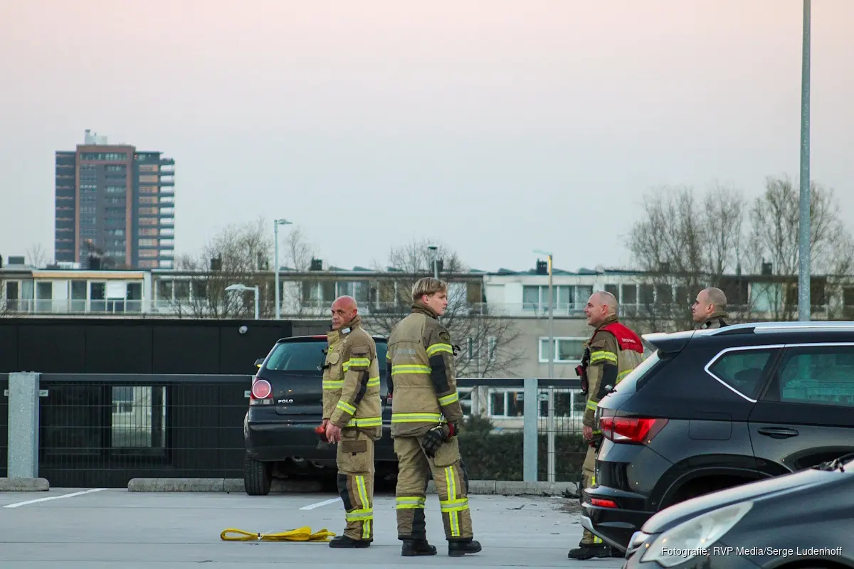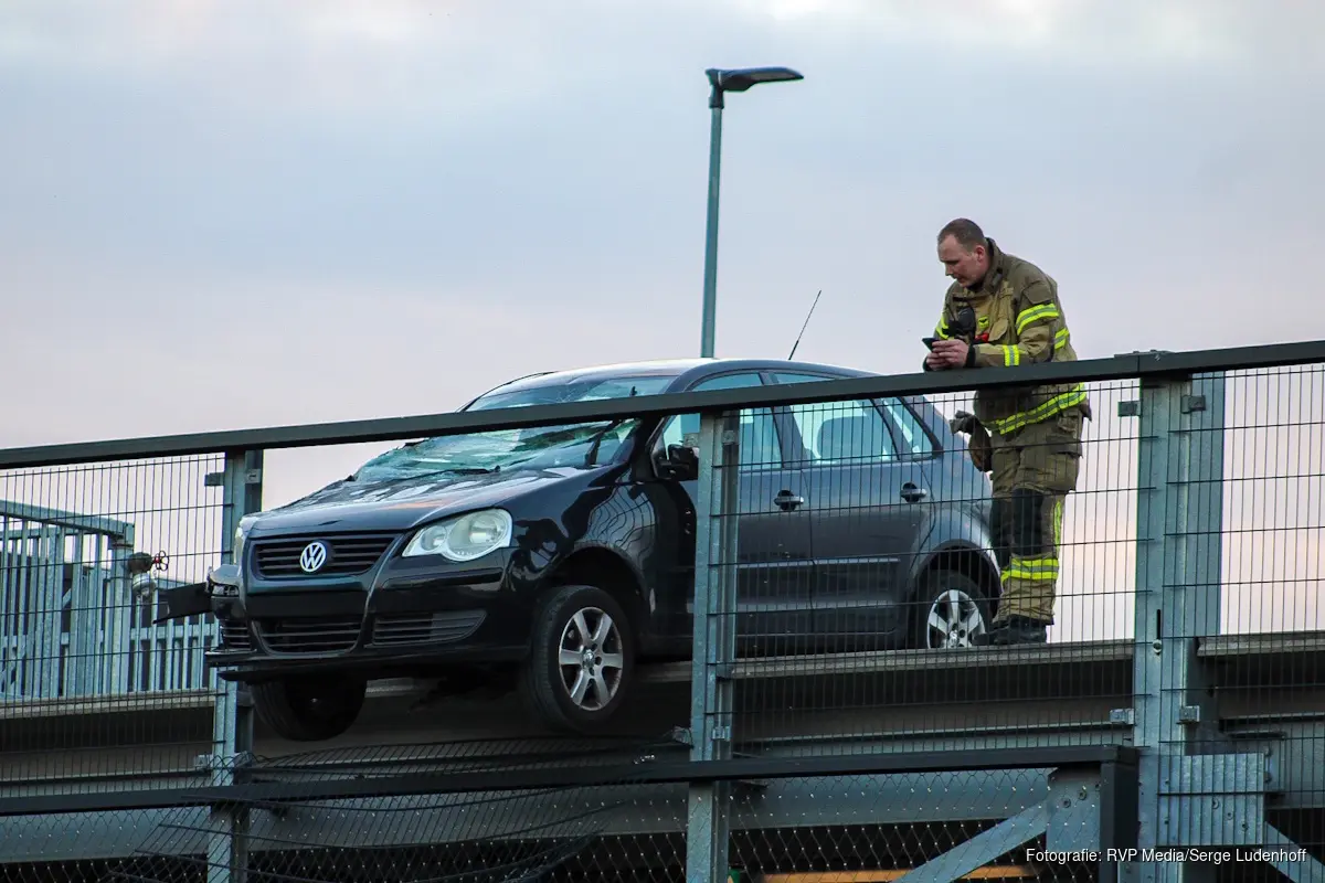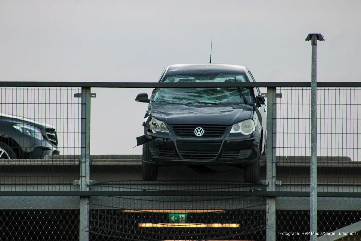 Een auto stond geparkeerd op het dak van een parkeergarage toen de bestuurder door nog onbekende oorzaak rechtdoor reed en bijna van het parkeerdek af ging. Het voertuig kwam tot stilstand tegen een stalen buis, waardoor het niet naar beneden viel.