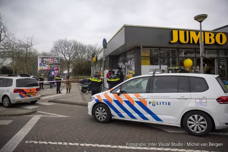 Het gebied voor de Jumbo supermarkt en een stuk parkeerterrein is afgezet voor sporenonderzoek. Op de grond zijn spetters bloed te zien.