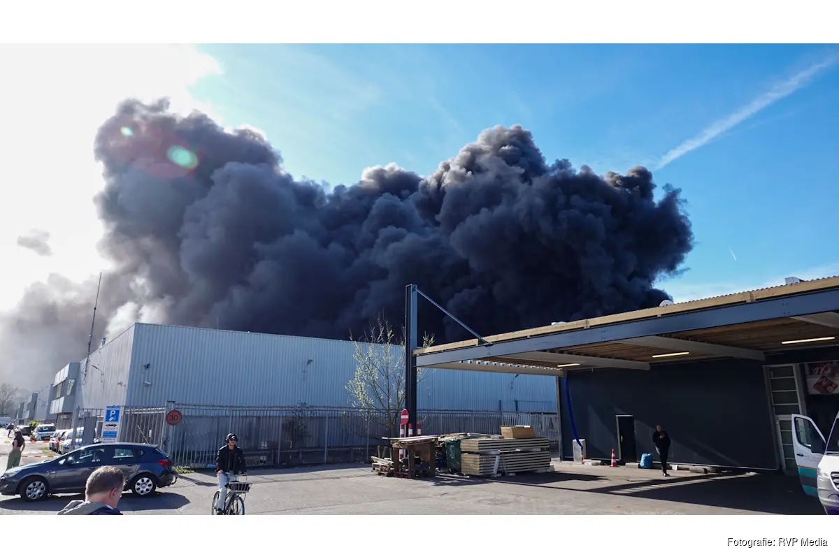 De rookwolken zijn boven de gehele stad zichtbaar. De brand woedt in een bedrijfsverzamelgebouw. De omliggende straten zijn volledig afgesloten vanwege de brand.