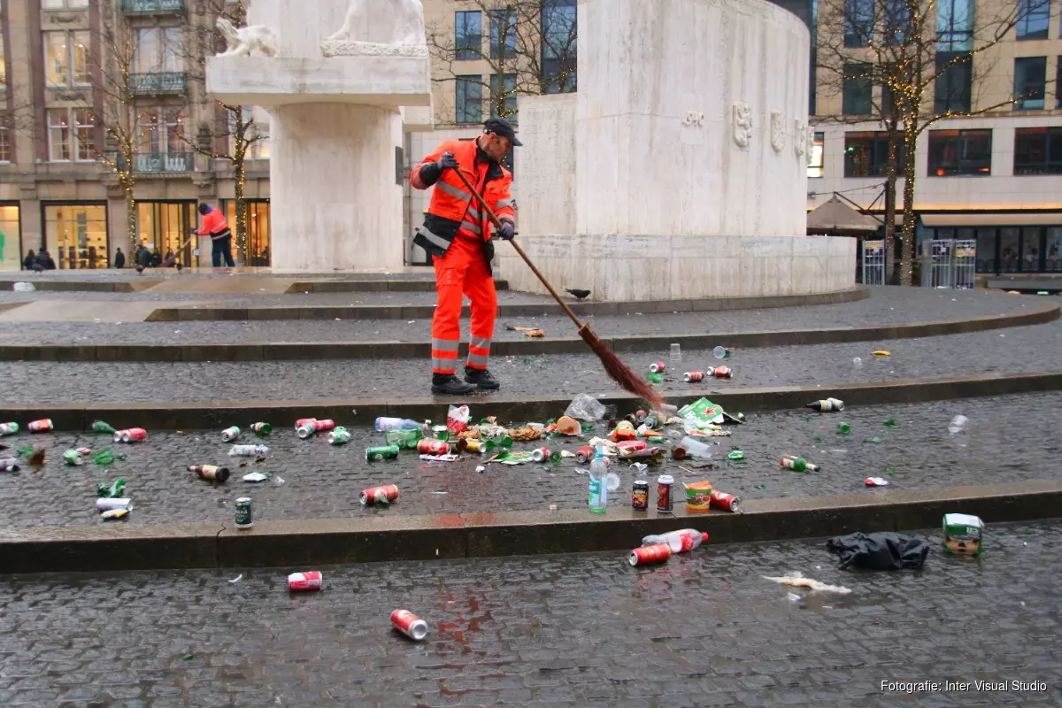 AMSTERDAM - Donderdagmiddag is de stadsreiniging druk met rommel van supporters die is achtergelaten op de Dam in Amsterdam.