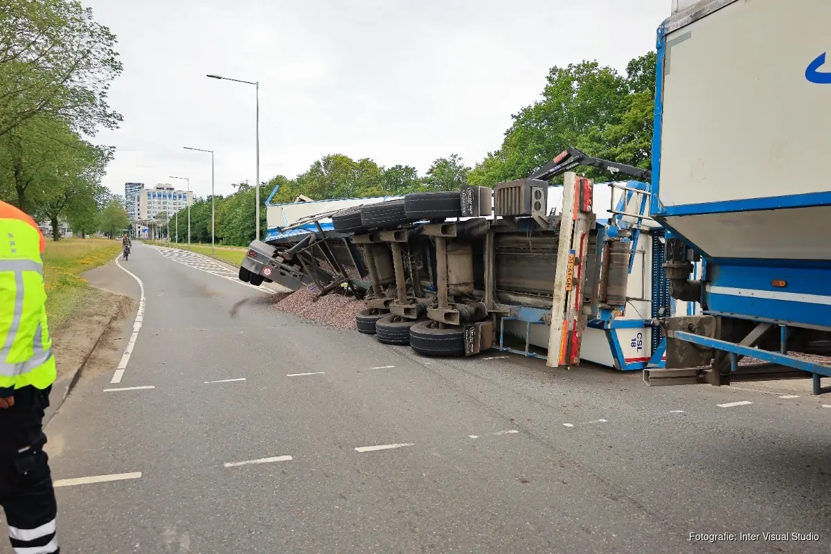 Een oplegger met daarin grind is gekanteld nadat de bestuurder moest uitwijken. Het grind kwam in de berm en het fietspad terecht. Een aannemer werd ingeschakeld voor de opruimwerkzaamheden en het terug kantelen van de oplegger.