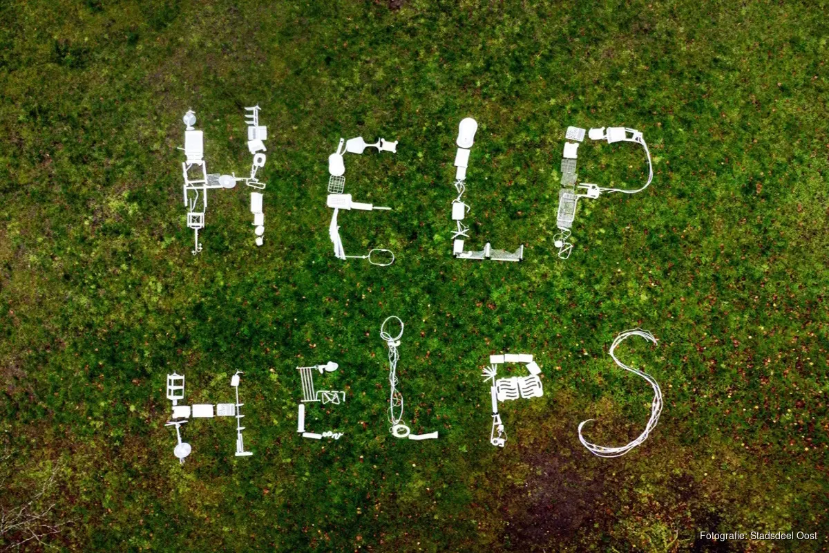 De tekst Help Helps bestaat volledig uit witte voorwerpen uit de buurt: ventilatoren, droogrekken, stoelen, een bouwhelm, zelfs een pastamaker. Stuk voor stuk spullen die normaal in de afvalstroom zouden verdwijnen. Buurtbewoners verzamelden ze speciaal voor dit project, dat aandacht vraagt voor de afvaldruk in de stad en de impact van onze consumptieroutine.