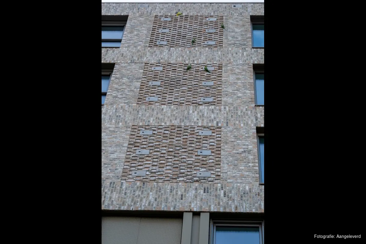 Wie omhoogkijkt, ziet meer dan stenen alleen. Tussen het groen op het dak staat een insectenhotel. In de dakranden zitten nestkasten verscholen die vogels onderdak bieden. Een familie halsbandparkieten heeft er inmiddels al haar intrek genomen.