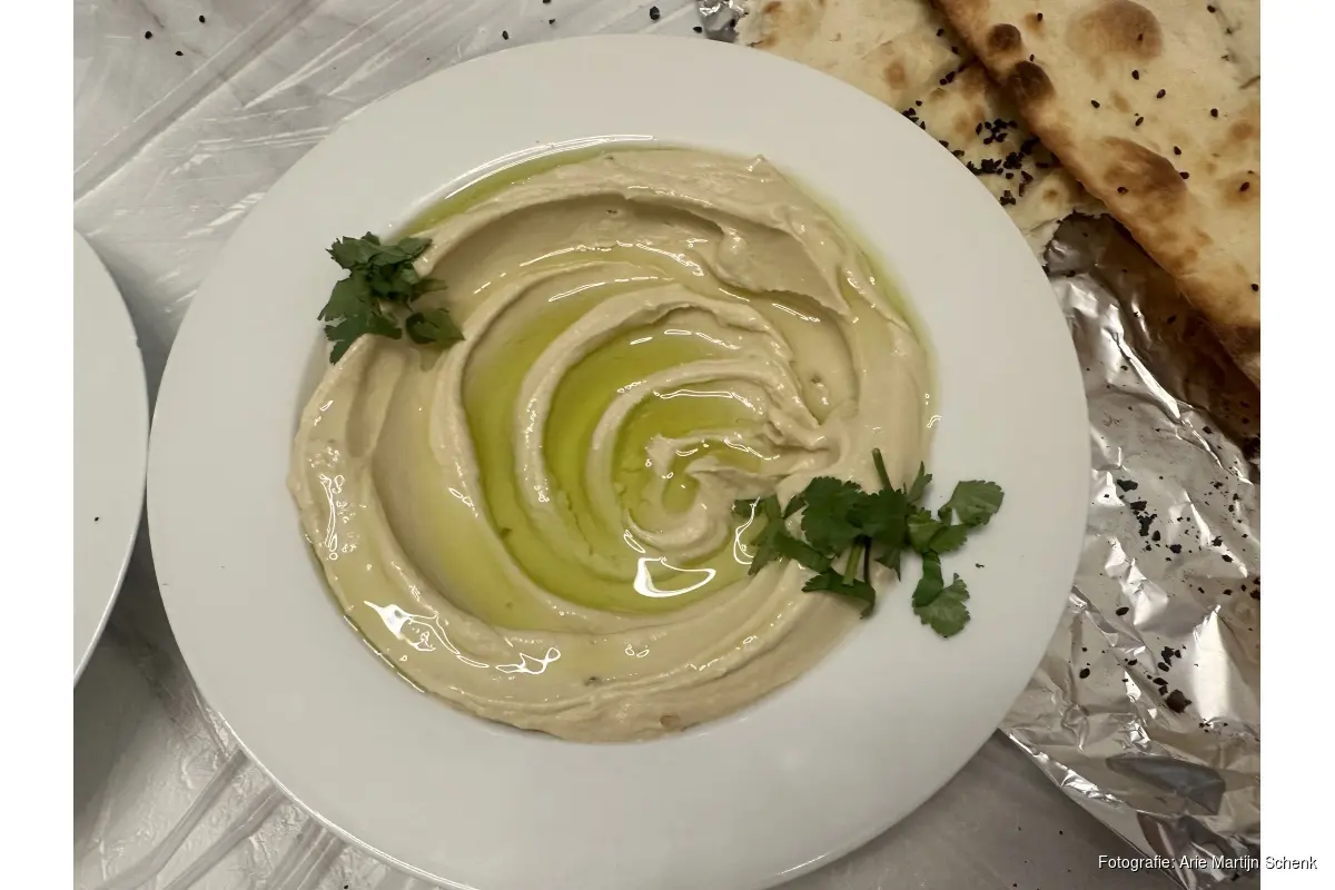 Al snel verschijnen schaaltjes hummus, baba ghanoush en een frisse salade op tafel, geserveerd met warm brood dat rechtstreeks uit de oven komt en geurt naar zwarte komijn. Een rustige start van een late lunch, waarna de aandacht verschuift naar de uitgebreide viskaart.