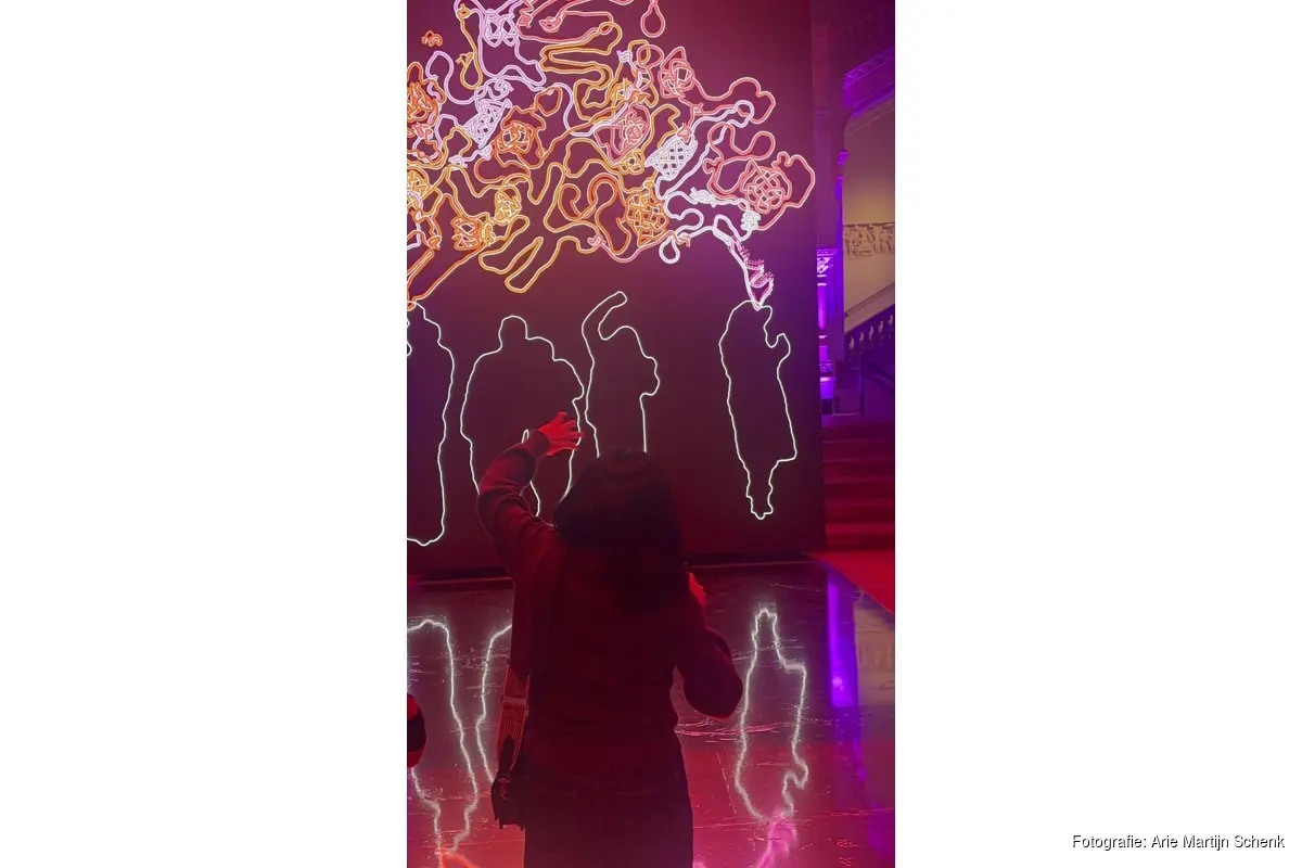 In de hal trok één werk direct de aandacht: een interactief lichtkunstwerk van een Chinese kunstenaar, speciaal ontwikkeld voor het Wereldmuseum. De installatie draait om een knoop die je kunt aantrekken of juist losmaken. 'Het maakt je medeplichtig,' zei Van Bommel. Op verschillende avonden blijft het Wereldmuseum extra geopend, zodat bezoekers dit kunstwerk ook na sluitingstijd kunnen ervaren.