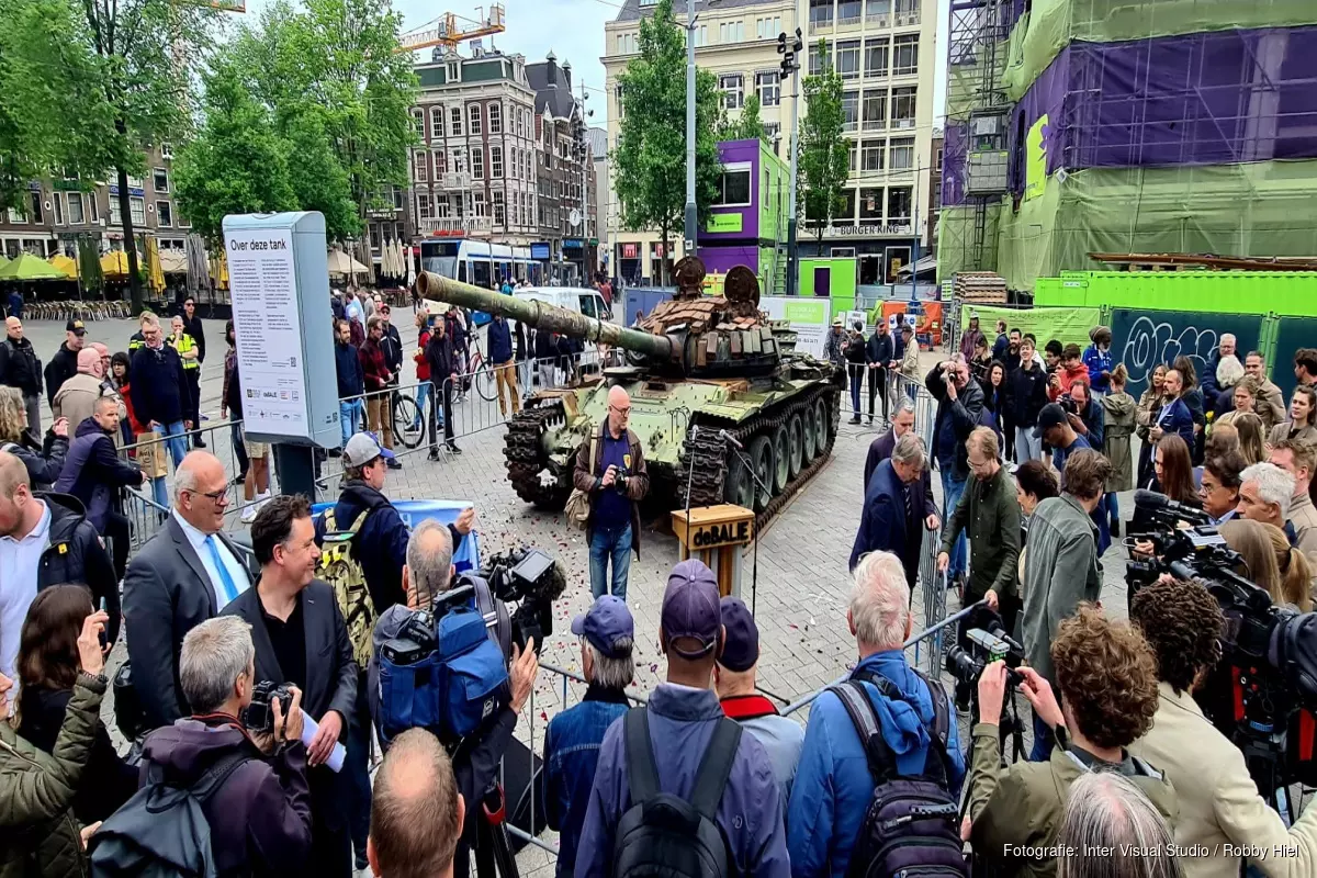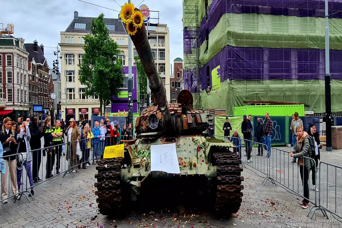 AMSTERDAM - Een beschadigde Russische legertank is momenteel te bewonderen op het Leidseplein. De tank wordt tentoongesteld door debatcentrum De Balie, met als doel aandacht te vragen voor democratie in Europa. De tank blijft elf dagen lang te bezichtigen.