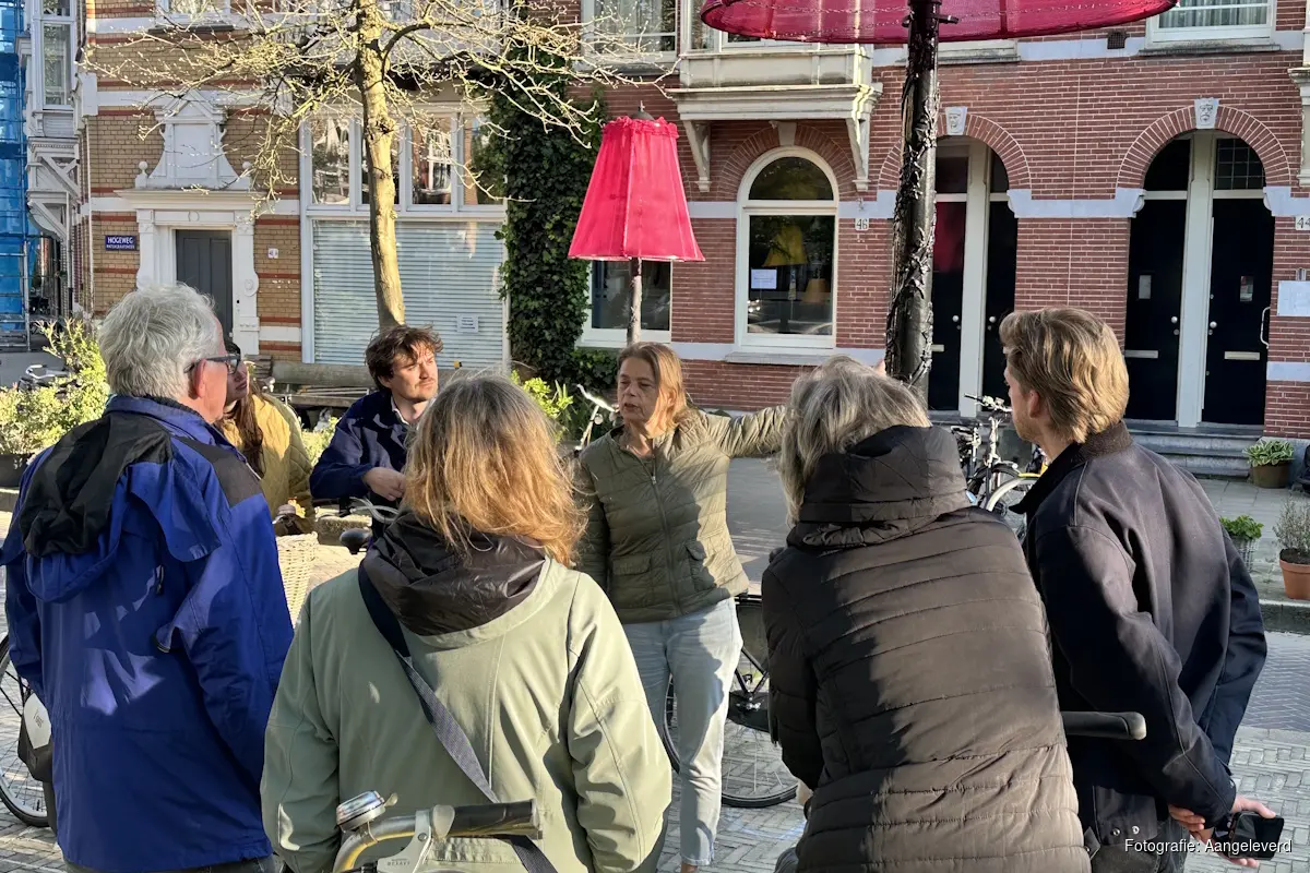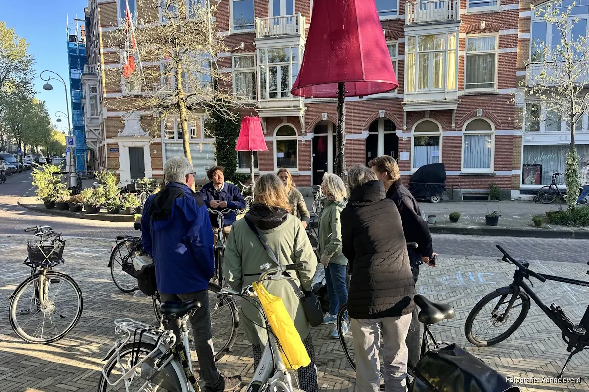 Eveline heette de deelnemers welkom en nam een groep zeer geïnteresseerde en actieve buurtbewoners mee op pad. De groep fietste eerst langs de contouren van de Watergraafsmeer, van Mojo tot aan De Omval. Daarna ging de tocht via Park Frankendael naar Huize Frankendael. Via het Linnaeushof keerde het gezelschap even na 21.00 uur terug bij de fontein aan de Hogeweg.