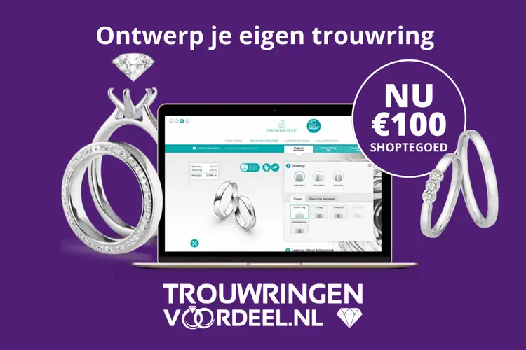 Bij trouwringenvoordeel.nl kun je namelijk je eigen trouwringen ontwerpen. En alsof dat nog niet genoeg is, geven we je ook nog eens 100 euro shoptegoed cadeau!